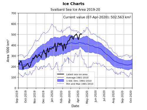 From 3-7 April this year, sea ice around Svalbard Norway has been the highest since 1988, but only 6th or 7th highest since records began in the 1970s. Pack ice this year surrounds Bear Island (Bjørnøya) at the southern end of the archipelago for the first time since 2009 at this date, and continues the pattern of high extent and thickness of ice in the Barents Sea since last summer.