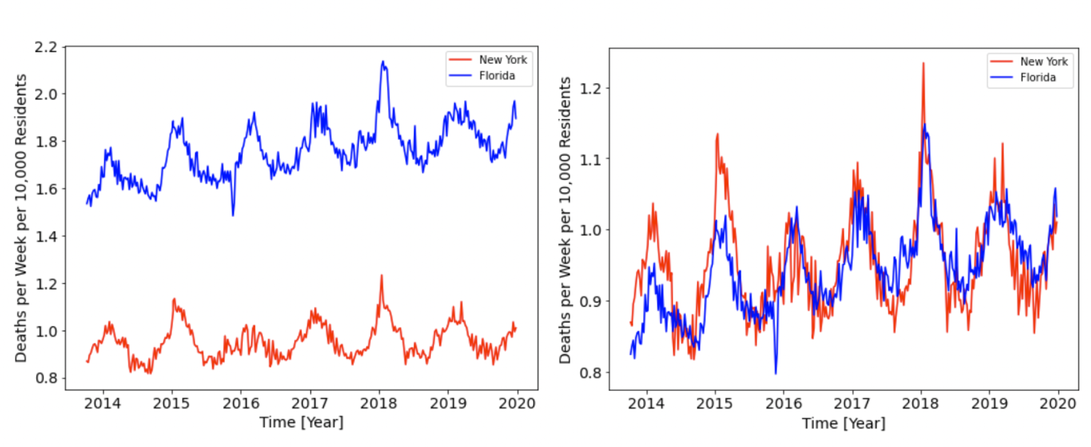 In the example shown in Figure 1, the health-status correction factor of Florida is Hstate = 0.537, indicating that New York experienced 53.7% fewer Dpcw than Florida in the years 2014 to 2020, likely owing in part to the older population in Florida. For each state-wise comparison of Dpcw we adopt this ratio as a correction factor to bring the pair of states onto the same scale, allowing for a health-status-corrected comparison of mortality during the pandemic period.
