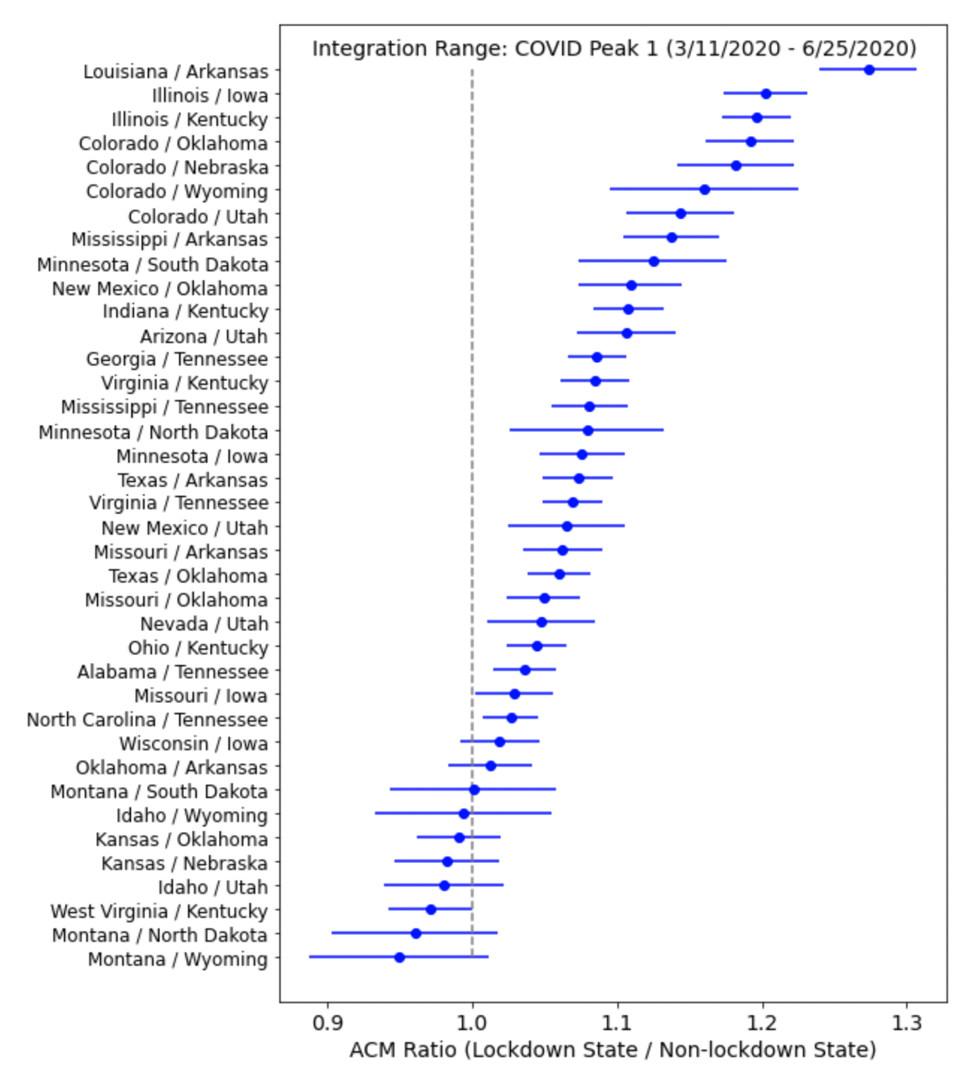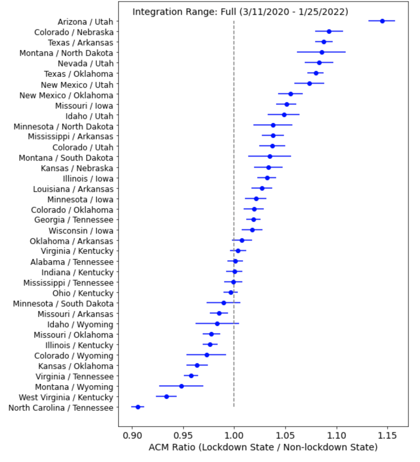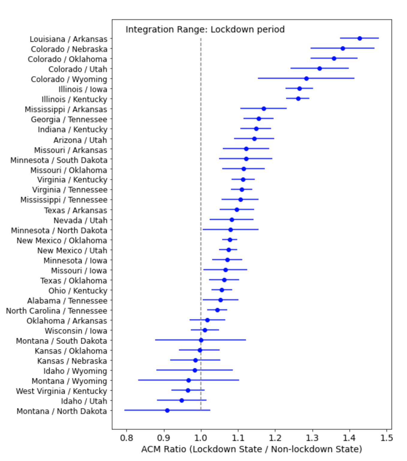 This health-status correction factor is justified since we are performing a differential comparison between states with and without lockdowns. We are asking, “Following the enactment of lockdown measures, what is the fractional difference between the adjusted per capita ACM in each pair of states?” This assumes that after removing differences in the health status of the populations of neighboring states, the largest effect on the adjusted per capita ACM was the enactment of a lockdown. This assumption is justified given that the lockdowns are expected to result in massive disruptions to national and regional economies, healthcare systems, and general social fabric.