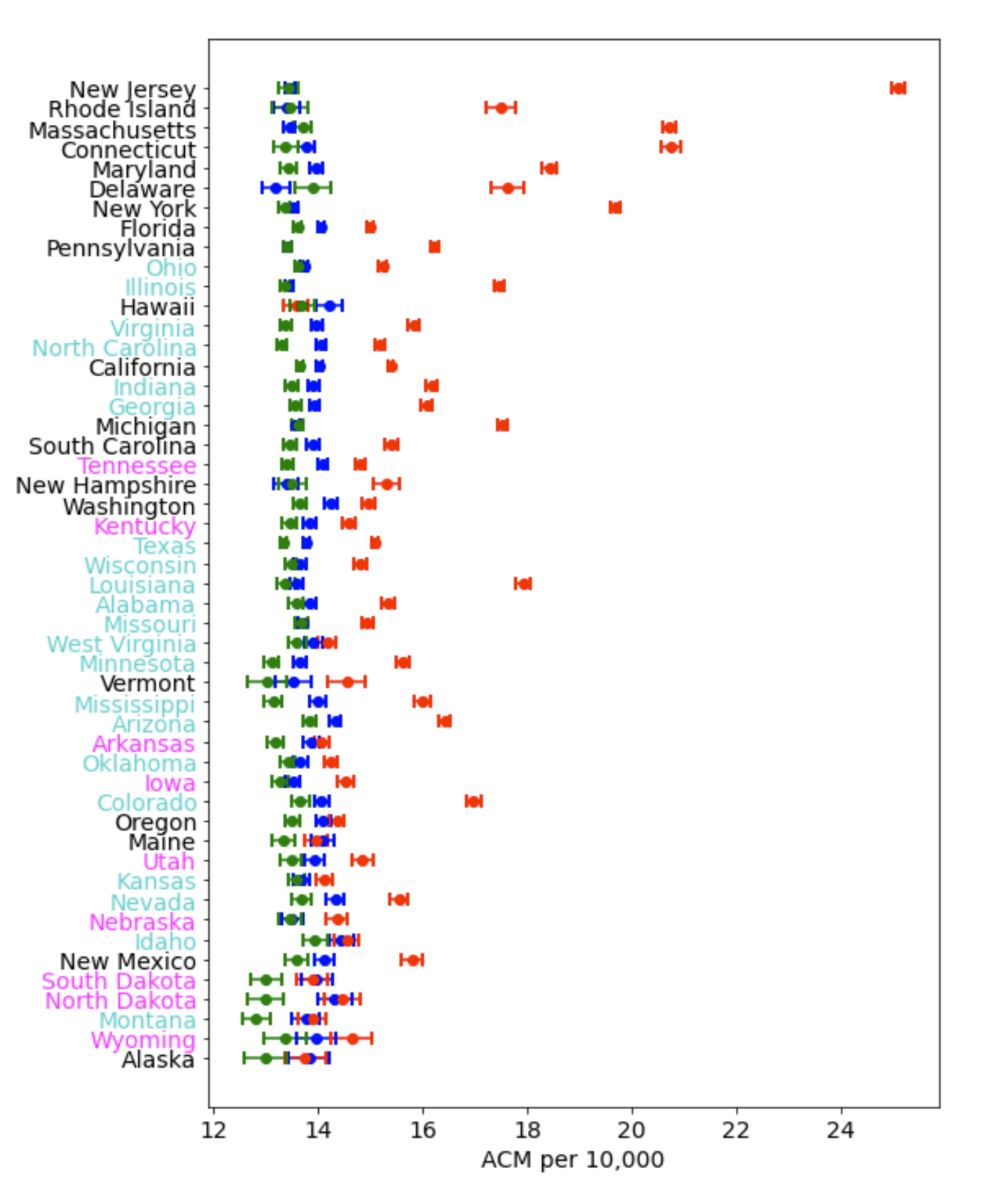 The values of health-status-corrected integrated all-cause mortality in the 15-week “cp1” periods of 2019 and 2018 are tightly constrained for all states to a value of approximately 14 deaths per 10,000 (Figure 5), whereas the corresponding values in the COVID period are widely different from state to state, ranging from the 2019 baseline value to as high as 25 per 10,000 for New Jersey, and being typically as large as 15 to 21 per 10,000. Non-lockdown states have names on the y-axis coloured magenta, while the lockdown states used as our comparands in calculating R are coloured cyan.