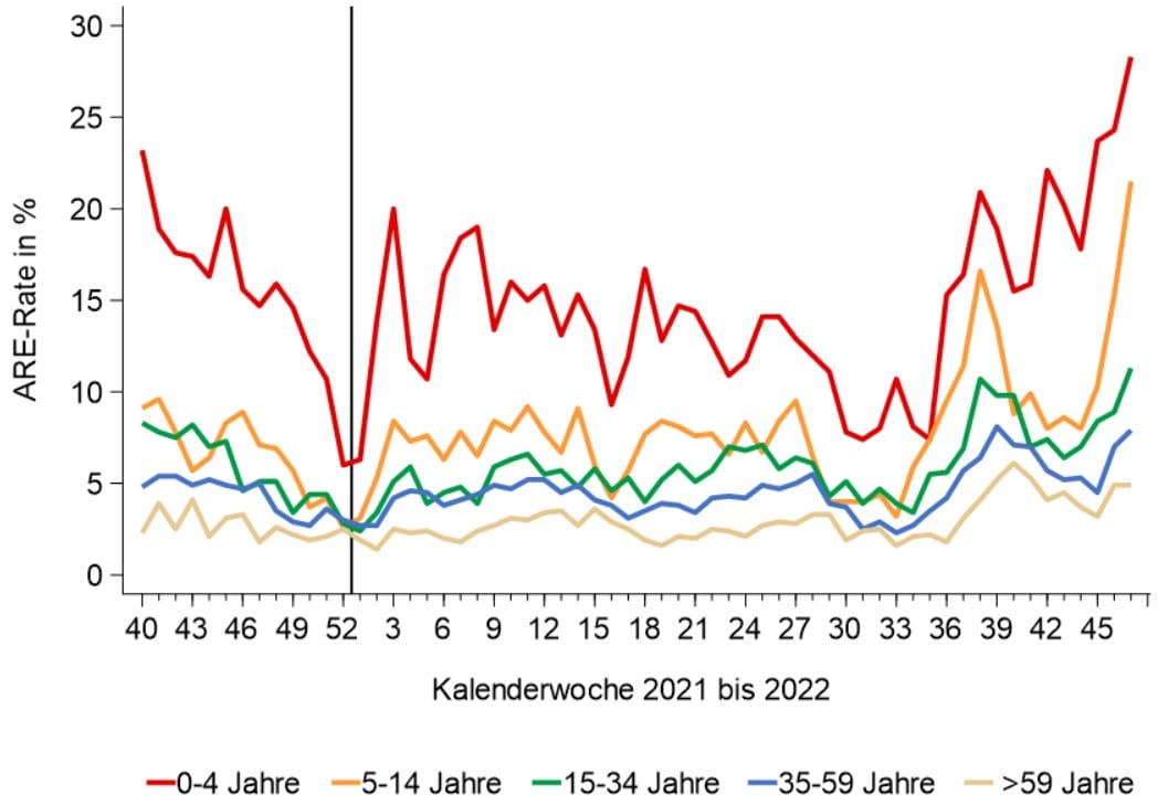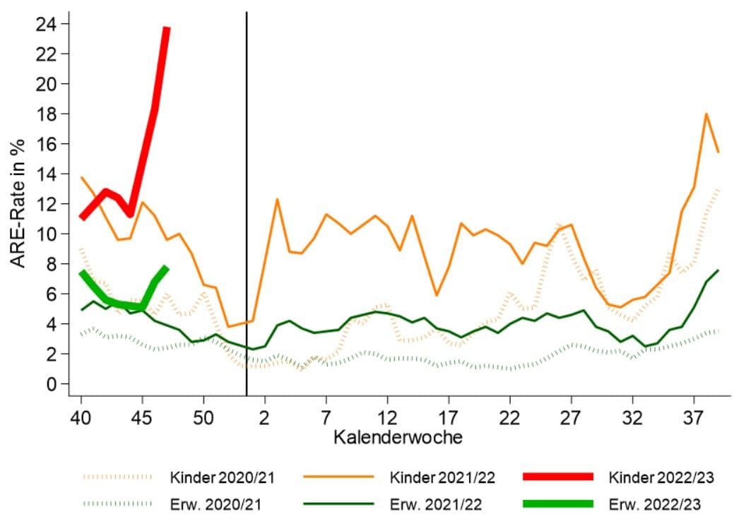 The same thing is happening in Germany where Eugyppius reports The German Fever Gauge, Grippe Web, suggests nearly one in four German children under 15 is currently suffering some kind of respiratory infection.