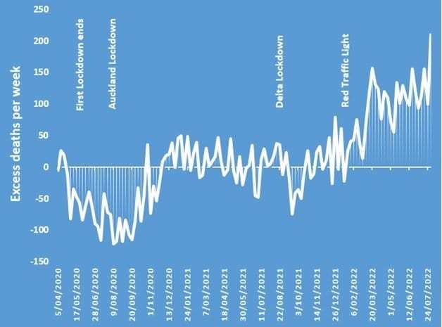For those academically and scientifically inclined, Professor Gibson’s article extrapolates data about New Zealand’s excess deaths between April 2020 until July 2022. The following graph from the article shows that from November 2021 there have been approximately 3000 excess deaths. Over 1000 of these excess deaths are unrelated to COVID-19 as either an underlying cause or contributory factor.