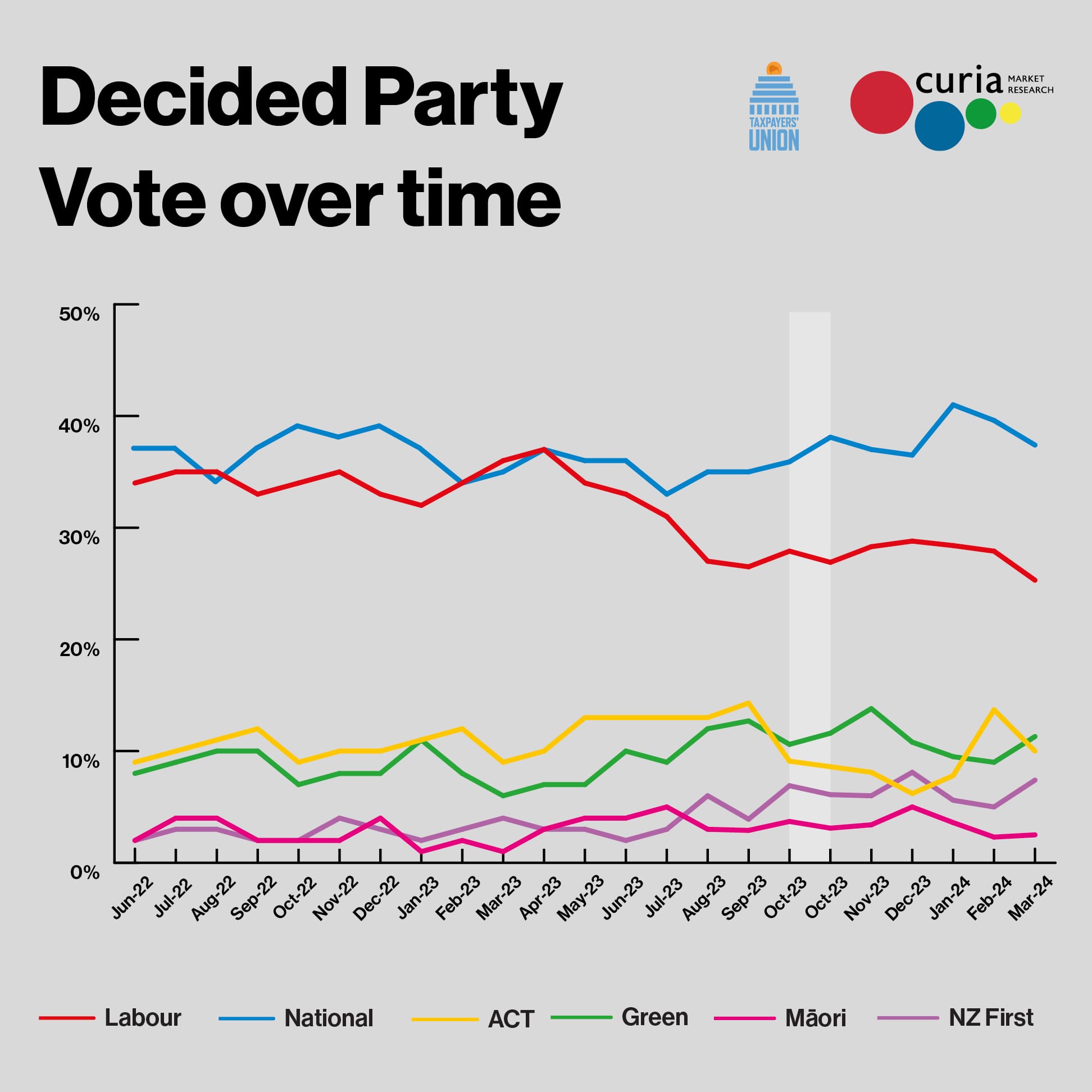 For the decided party vote, National is down 2.2 points on last month’s poll to 37.4% while Labour also drops to 25.3% (-2.6 points) – this is Labour’s lowest score since our poll began in January 2021. The Greens get a 2.3 point boost taking them to 11.3% – also putting them ahead of ACT who dropped back down to 10.0% (-3.7%).