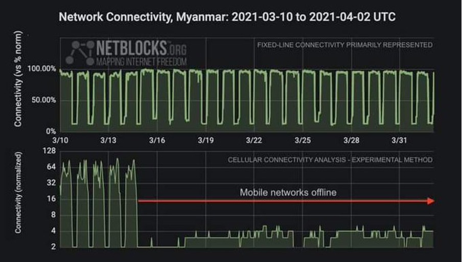 Underneath is the reason why it is so difficult to get information from Myanmar. Mobile networks have been offline since 15th March and network connectivity is sporadic to say the least.