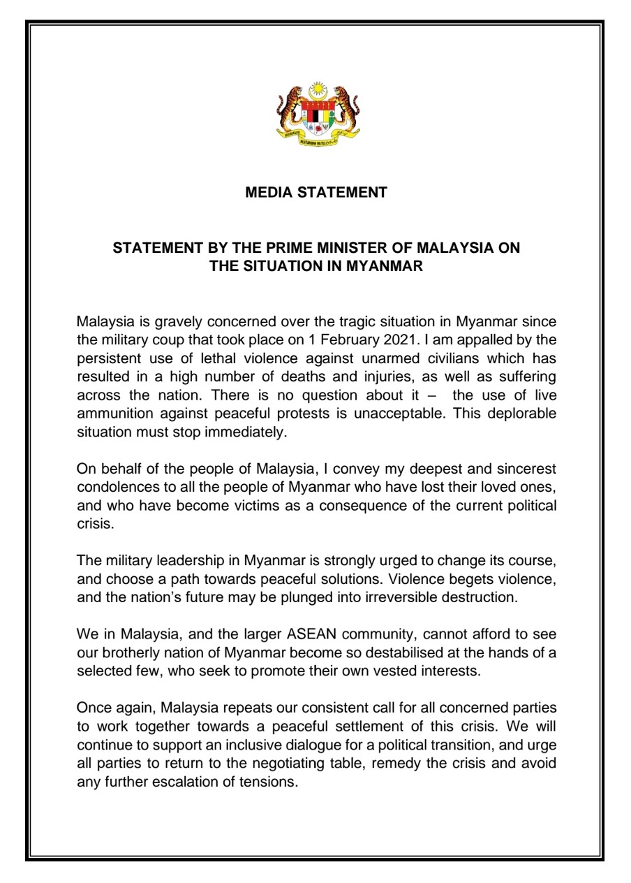 Malaysia issued a formal statement today which, by ASEAN standards is as hard-hitting as it gets.