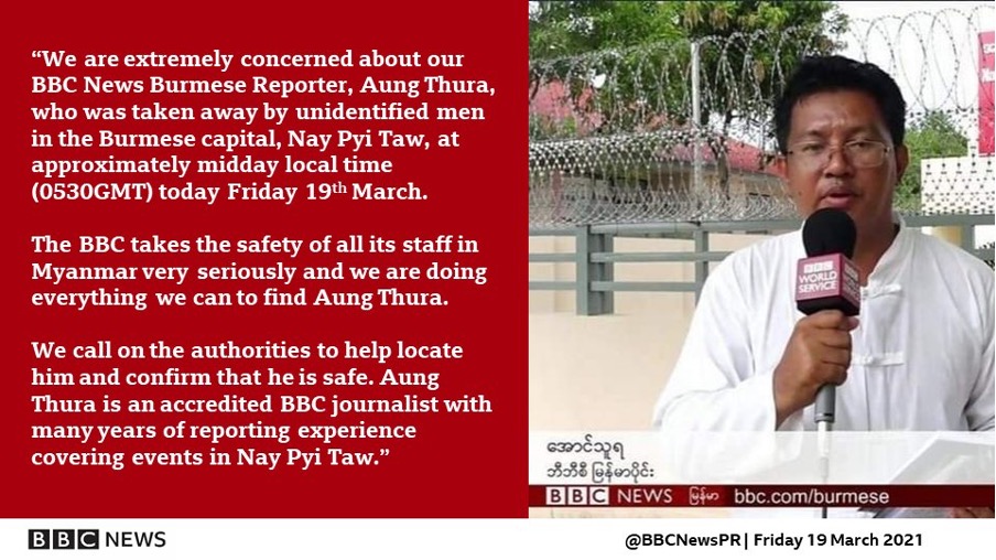 Ko Aung Thura, a local correspondent for the BBC, and Ko Than Htike Aung from Mizzima News were taken away by plainclothes police in Naypyitaw, Myanmar’s capital, on Friday.