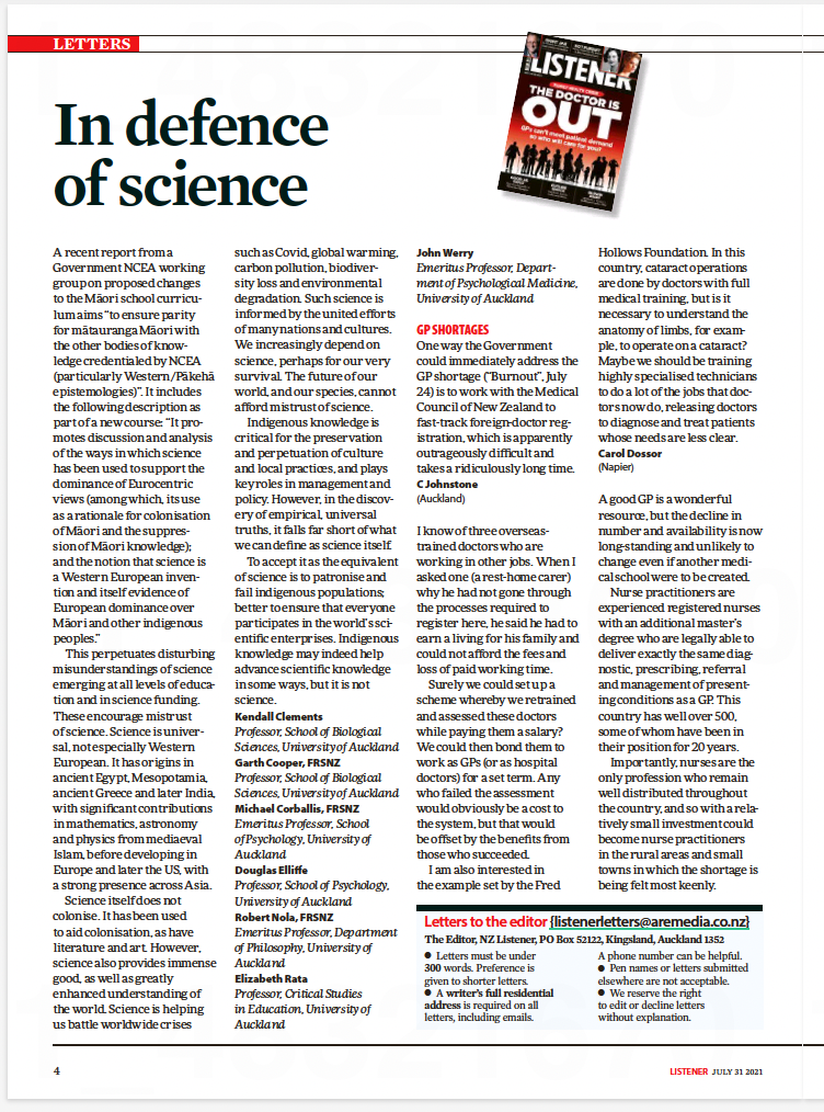Dr Wiles also tweeted a request for reinforcements: “Calling all academics in Aotearoa New Zealand. Add your name to the open letter if you are also appalled by that letter claiming to defend science published last week in the NZ Listener. It’s caused untold harm and hurt & points to major problems with some of our colleagues.” More than 2000 academics, students and alumni from all over New Zealand answered her call and signed (although how many had actually read the original letter to the Listener remains uncertain).
