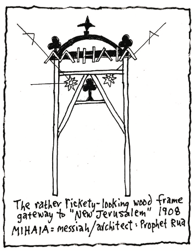 1905 – A Maori named Ruakenana from Ruatahuna, Urewera, has a vision and goes to see King Edward VII who was supposed to be visiting Gisborne in 1906, but never showed up. Undaunted Rua gets baptised instead and goes wandering in the wilderness for awhile (there’s lots of wilderness in Urewera to go wandering in); and then goes to Manugapohatu in 1908 and founds a religion called “Wairua Tapu”, and a settlement called “New Jerusalem”, with a gateway and two buildings in it called “Zion” and “New Jerusalem” where all his 1,000 followers called “Israelites” could live.