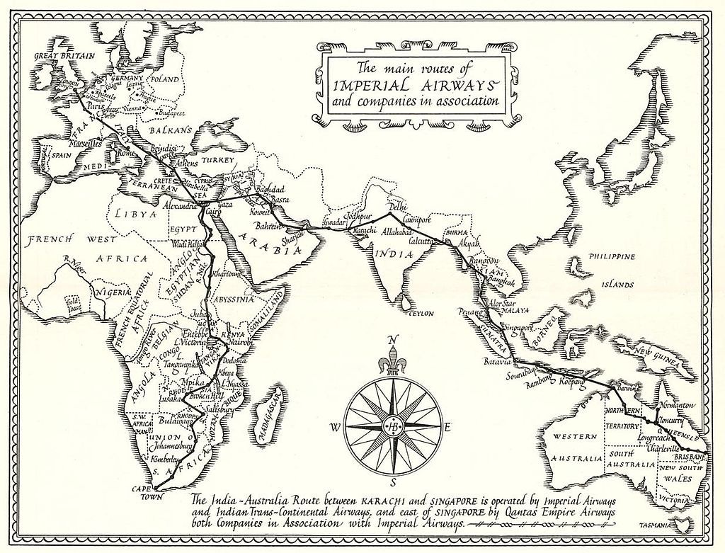 worldhistoryfacts: Air routes of Imperial Airways, 1935. Imperial Airways later became part of British Airways, but between 1924 and 1939, it was the main air travel option throughout the British Empire. Founded to help link the various parts of the empire together, it promised travel to “India in Days, not Weeks” and carried airmail for the British government.