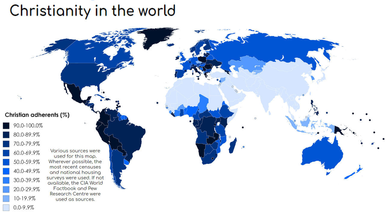 Christianity in the world. abu_doubleu: There are many maps on Christian percentages out on the internet, but the majority are not sourced and usually a bit outdated. Many also have very strange and arbitrary scales, like the one on Wikipedia that has 0-7%, 30-50%, and 90-100%. This one tries to use the most recent sources. […]