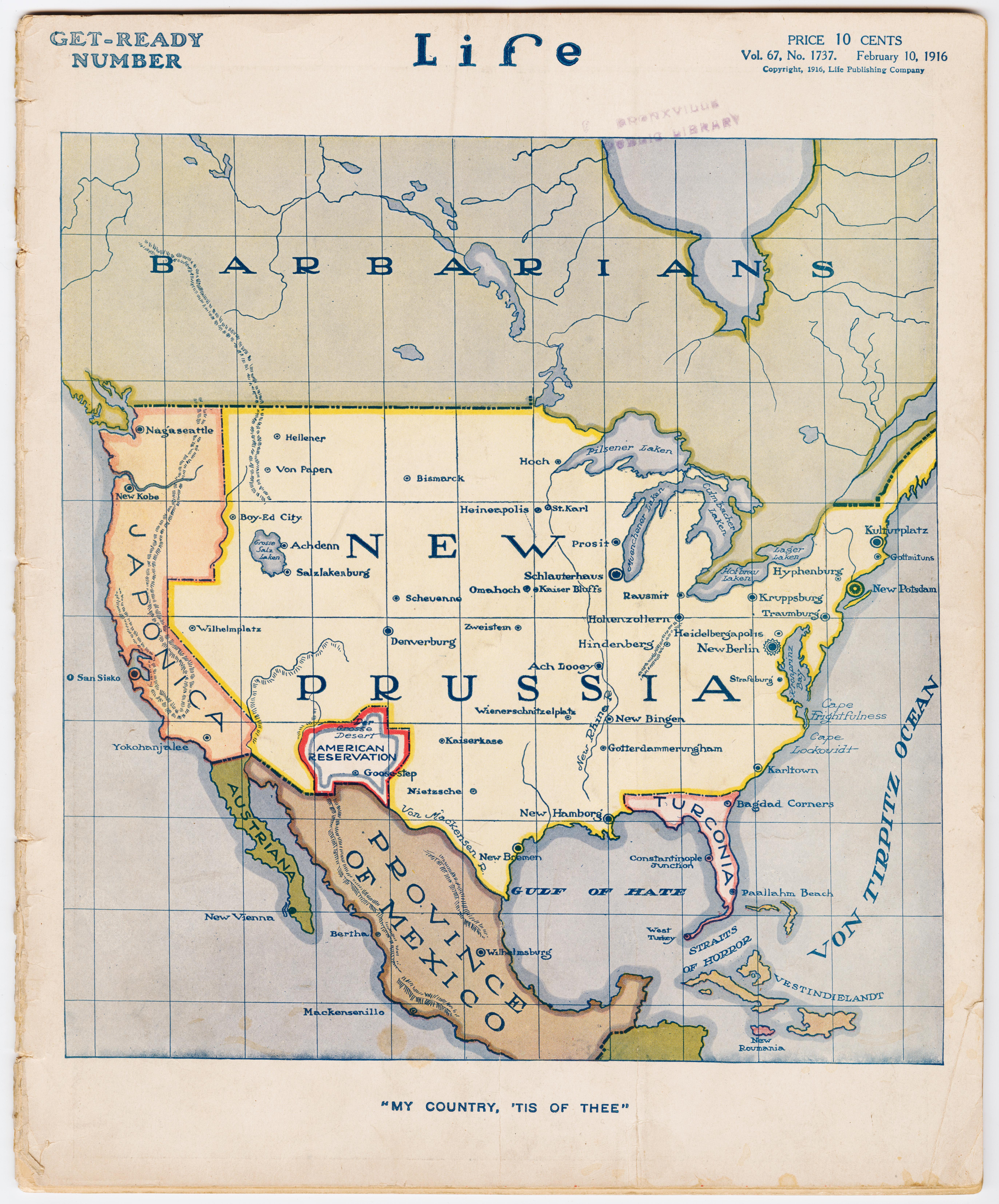 This map appeared on the cover of Life Magazine on 10 February 1916, urging direct U.S. action to oppose German aggression in Europe [5491 x 6618]