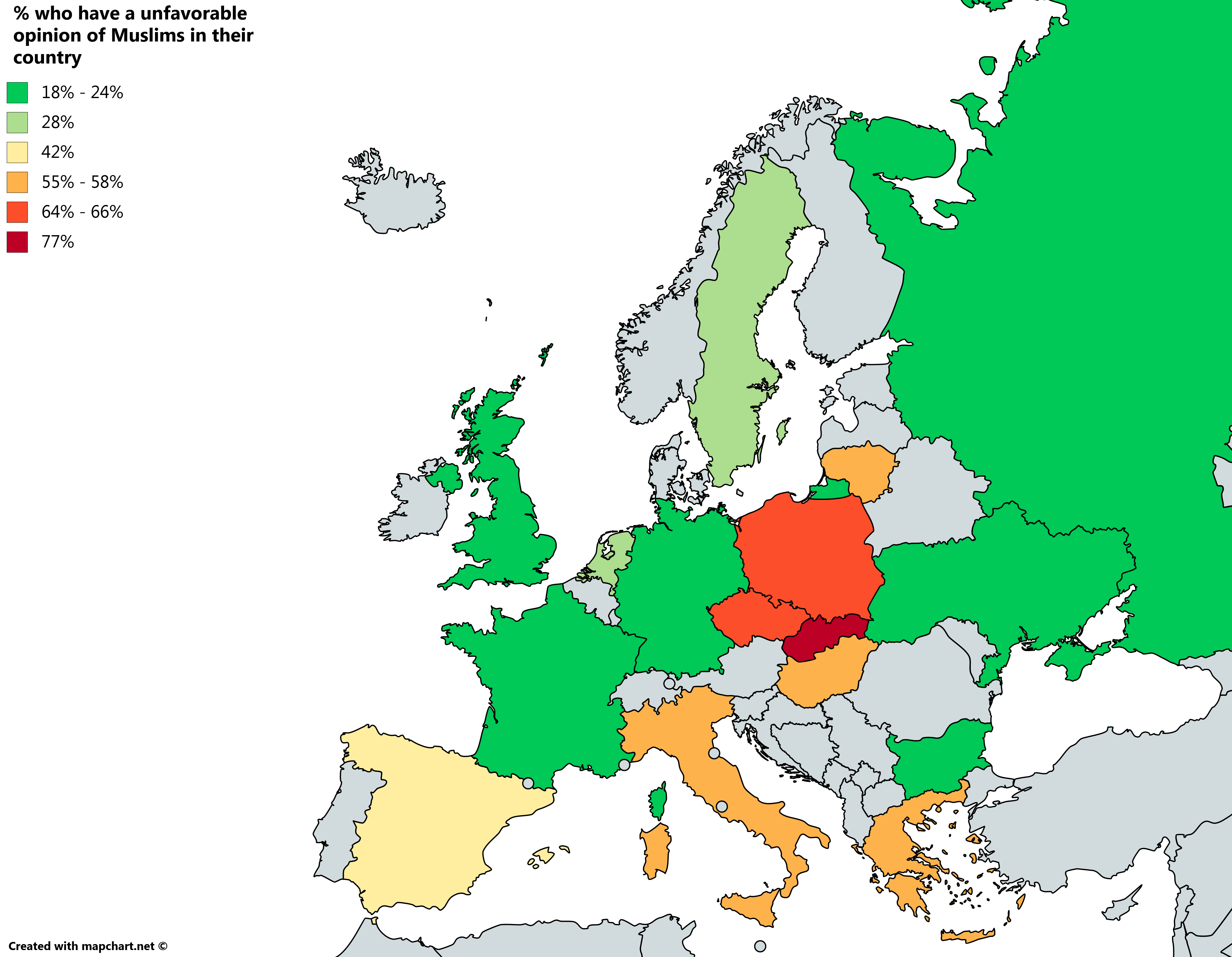 Map of the Day: % Who have a Unfavourable Opinion of Muslims in their Country (Pew Research 2019)