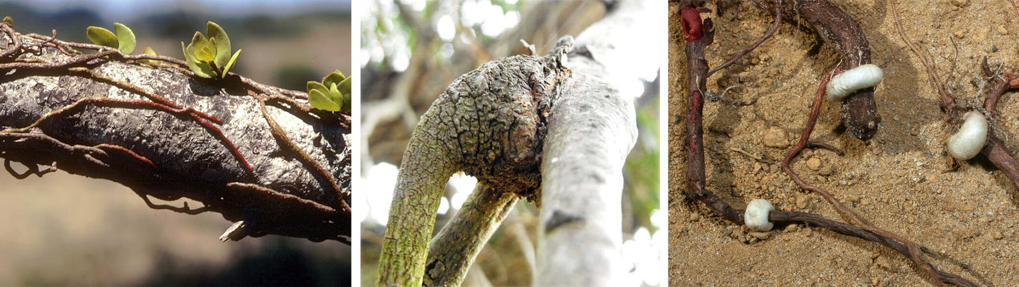 Mistletoes and other parasitic plants make a well-defined structure for invading their hosts — it’s called a haustorium, from the Latin word haustor, meaning drinker or drawer of water. Mistletoe haustoria are quite diverse, Wilson says, reflecting the varied ways they approach their parasitic habit.