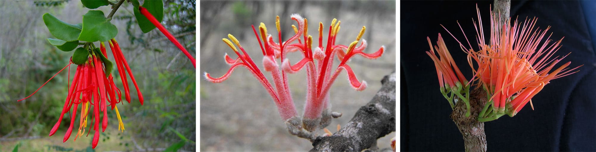 Birds do double duty: They also serve as pollinators — many mistletoe flowers are rich in nectar. Though the holiday-associated species have rather drab little flowers, others sport outlandishly showy blooms. “If you’re into floral diversity, mistletoes are a crowning glory,” Watson says. Many of the bird-pollinated species have gaudy, lipstick-red flowers, including South America’s Tristerix corymbosus, whose slender blooms are festooned with bright yellow stamens.
