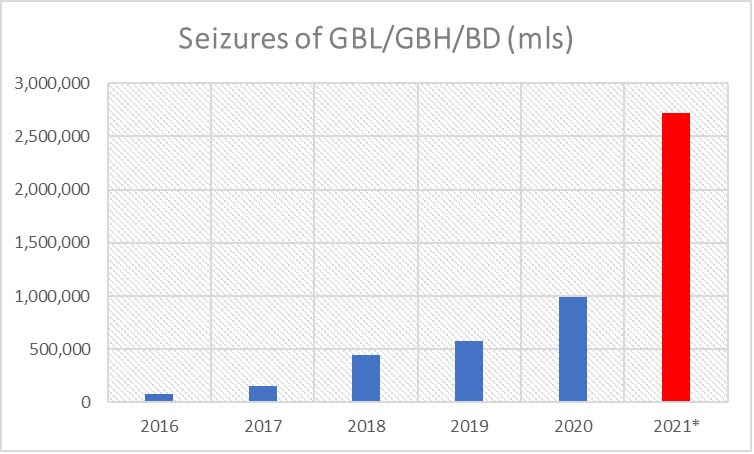 “More than 780 litres of the drugs GBL, GHB, and BD have been seized by Police and Customs in the first three months of 2021 compared to a total of just 83 Litres in the whole of 2016.”