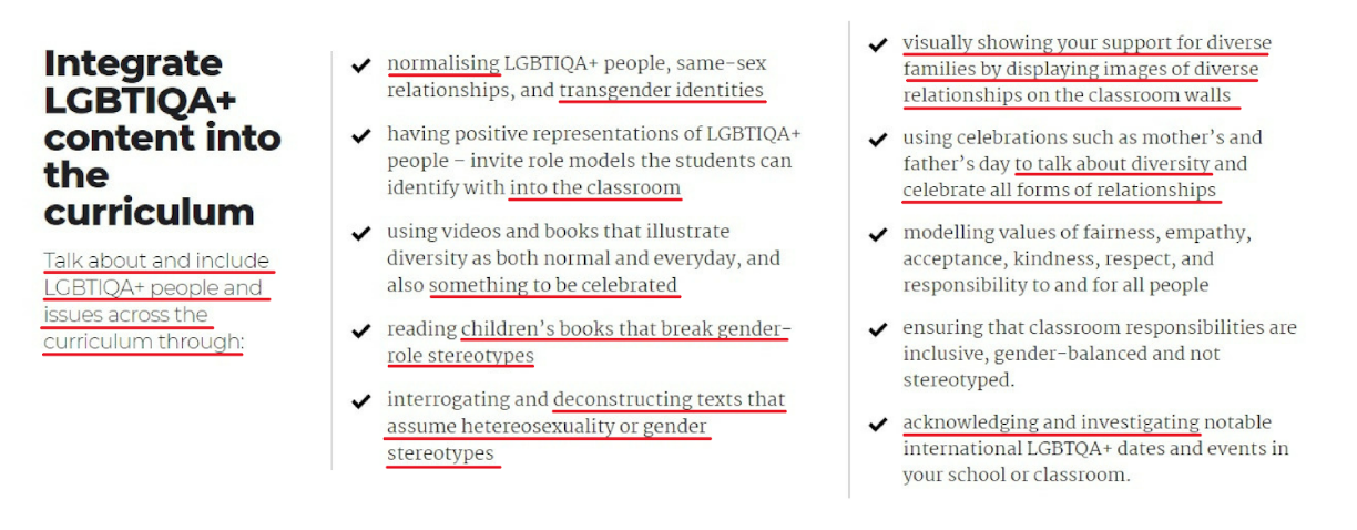 When we examine the LGBTIQA+ content, the expectation is that there is a school-wide approach. The Ministry has recommended that LGBTIQA+ themes be incorporated across the curriculum.
