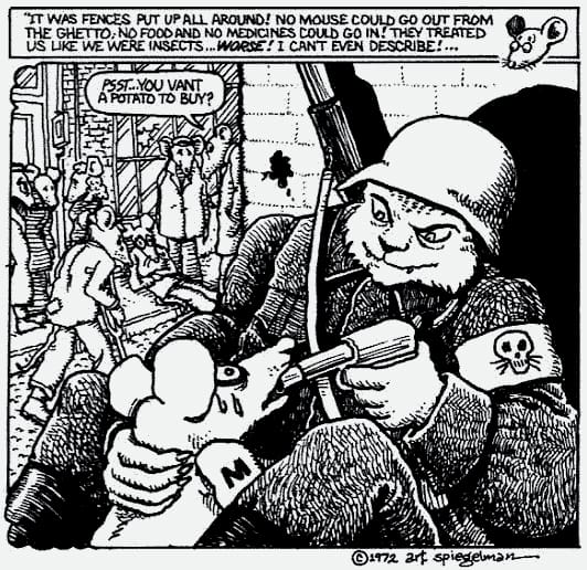Yes: a Holocaust narrative depicts children being killed. Because, you know, that’s what happened. Maus is almost entirely based on the story of Spiegelman’s parents, as well as how the shadow of the Holocaust hangs over succeeding generations.