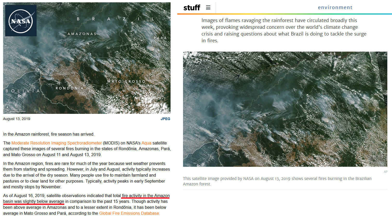 In an attempt to highlight the gravitas of the fires Stuff reproduces a NASA-supplied satellite image but neglects to include the NASA-supplied caption stating “fire activity was slightly below average in the Amazon Basin”. Perhaps the omission was an honest [cough] mistake but; methinks not: