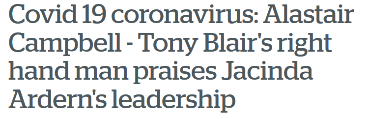 Hot on the heels of the love-fest following news of the USA’s most insignificant cable news channel ‘praising’ Ms Ardern’s leadership, followed by strictly-left Washington Post‘s column by New Zealander Anna Fifield, a glowing wee piece filed from the metropolis known as Havelock North, we now have headlines of “praise” from the Independent‘s Alastair Campbell.