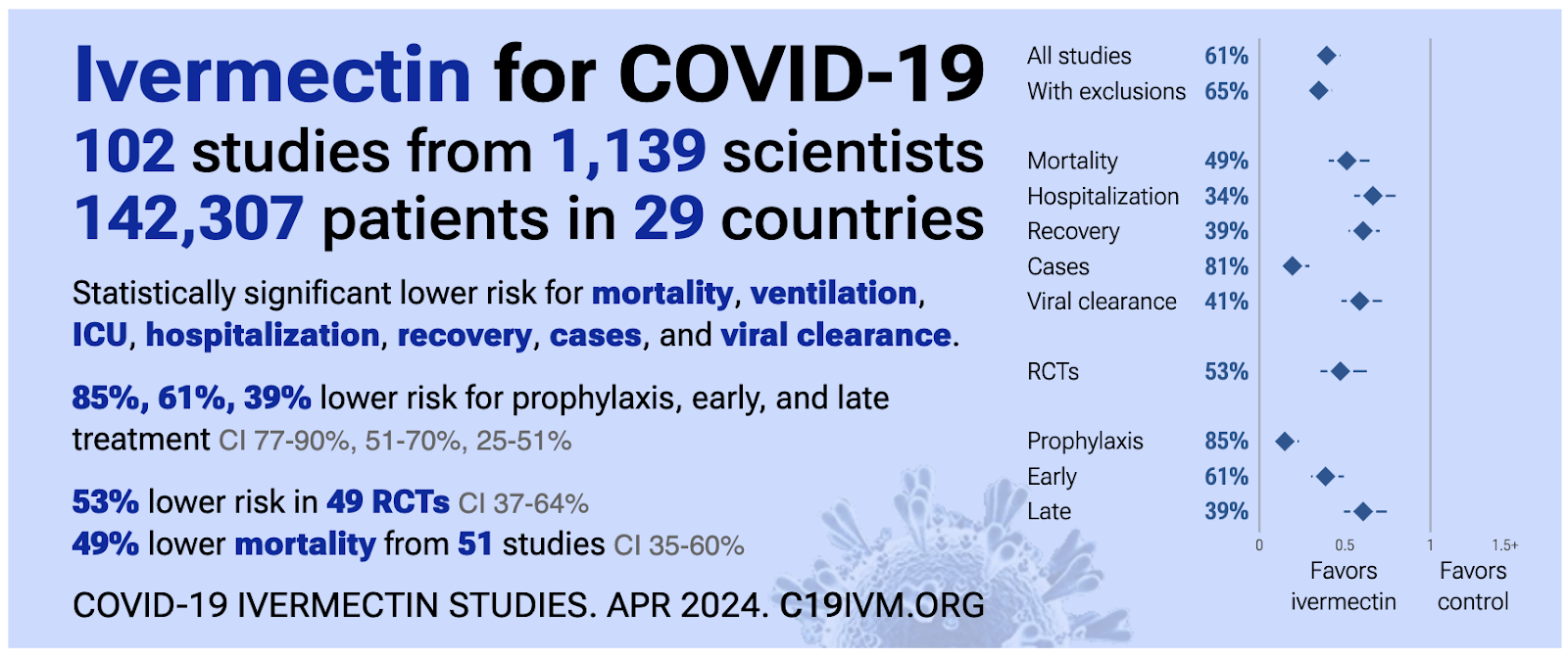 While I have stacks of electronic files and printed materials, dog-eared and food/drink-stained, there is a most elegantly presented meta-analysis website designed by some brainy and web-savvy scientists detailing over 100 studies from over 1,000 different scientists, involving over 140,000 patients in 29 countries describing the benefit and safety of ivermectin for Covid-19 treatment. It actually appears to be more extensive than Cochrane’s outdated review of ivermectin which only examined 14 trials – and excluded seven of them from consideration.