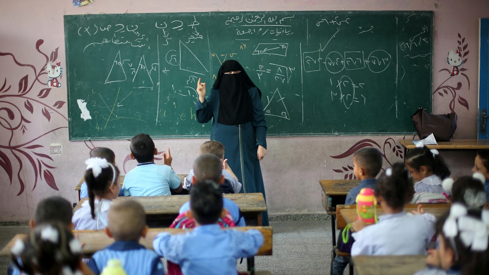 A veiled Palestinian teacher gives a mathematics lesson for schoolchildren in a classroom on the first day of a new school year, at a United Nations-run school in Khan Young in the southern Gaza Strip August 28, 2016. REUTERS/Ibraheem Abu Mustafa