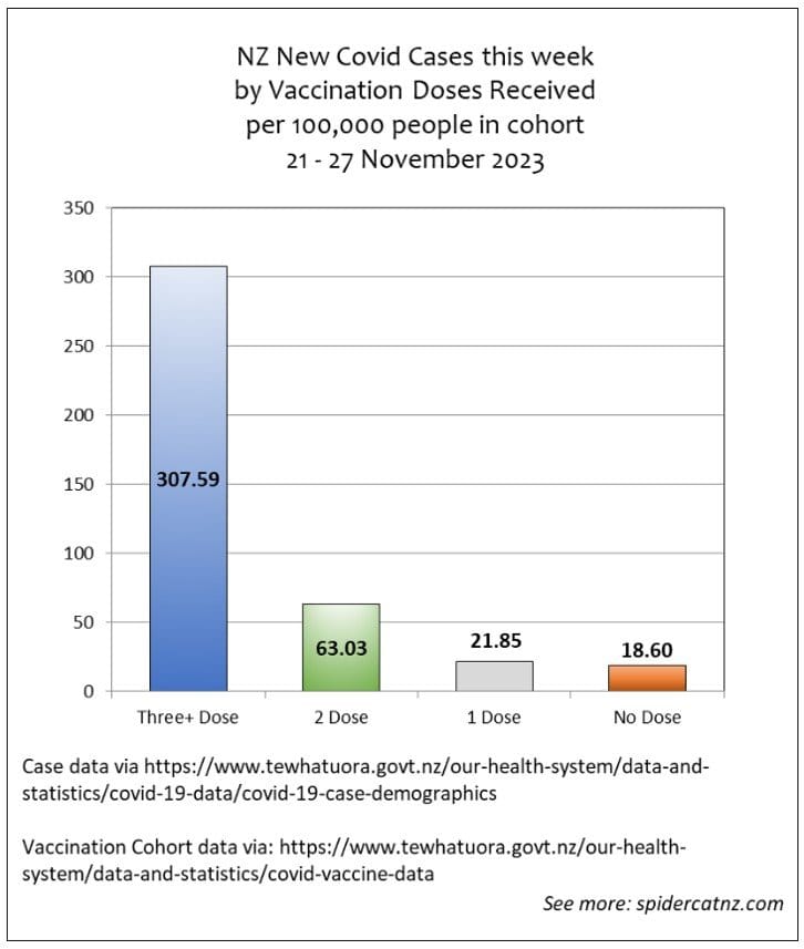 The vaccination status of the thousands of New Zealanders being (albeit dubiously) diagnosed with Covid-19 is clearly an extremely important indicator given the multiple ways in which vaccination status affects infection risk and severity of disease. The rates per 100,000 people in each vaccination status cohort reflect the lack of safety and ineffectiveness of the products Michael Baker appears to be employed to peddle.