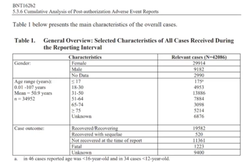 discussing Pfizer, BioNTech, the post-marketing report, FDA, deaths and adverse events.