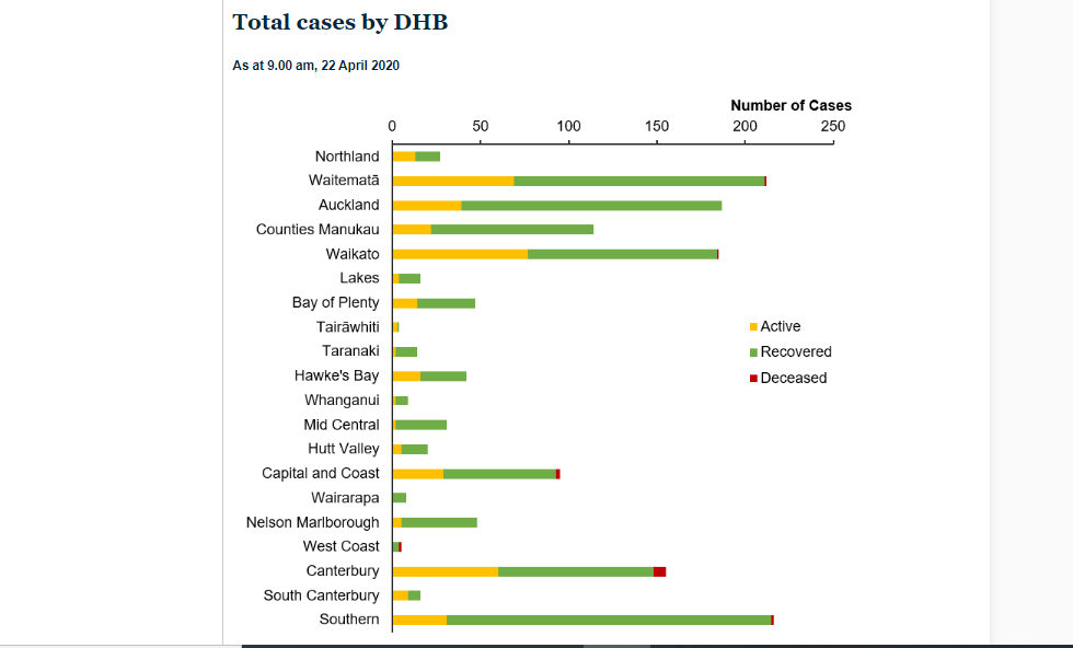 Well, funnily enough, a quick check of the Ministry of Health website on Thursday reveals a change in the way some of the various graphs are presented. Last week, for instance, the Total Cases by DHB graph was delineated with the Southern region at the top, having had the highest total number of cases, even though Southern didn’t have the greatest number of active cases. Today though, things are lined up geographically from North to South. Much better, well done MoH, thanks for listening, we’re always here to help.