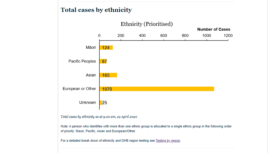The other graph that has changed is the Total Cases by Ethnicity. Whereas that graph used to have the ethnicity with the largest number of cases (European or other) at the top, graduating down to the lowest number of cases (unknown), for some reason the group at the top of the list is now Maori.