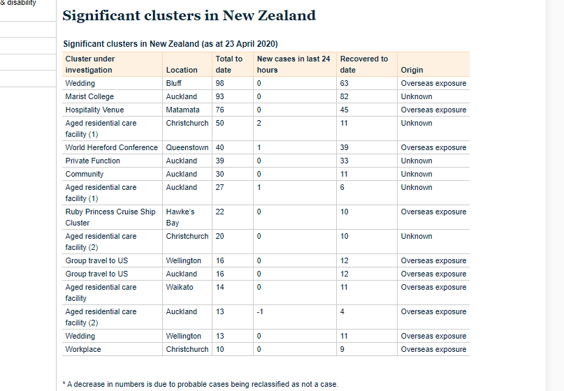 Interestingly one other change to a list is the Significant Clusters in NZ one below. On Monday that list didn’t show a ‘Recovered to Date’ column so that’s another positive. We can now see clearly that most of the clusters are over and done, most with only a small percentage shown as still infected, but remember that many of these will be in the non-proven ‘probable’ list so may well not even have had the virus.