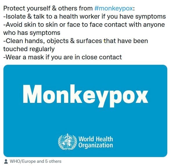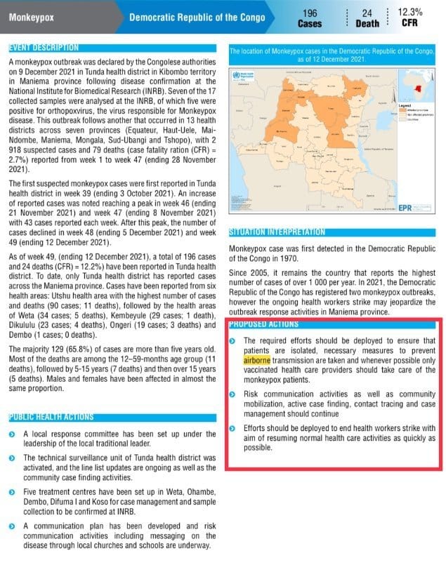 - Interestingly while “experts” are quoting the published medical literature stating that the monkeypox virus is spread through saliva and droplets, the WHO in 2021 posted a report implying that monkeypox was spread by airborne transmission. Another nudge for masks? This article can be found on the waybackmachine.