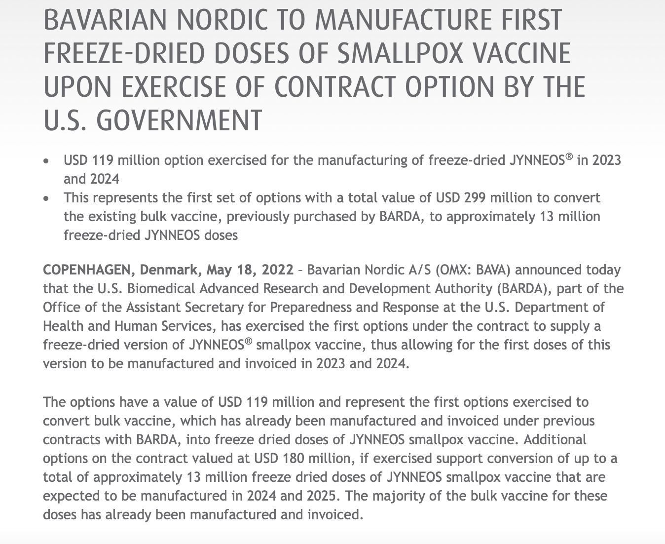 According to a press release from European pharma company Bavarian Nordic, the United States exercised a $119 million option on the doses. The vaccines were purchased through The Biomedical Advanced Research and Development Authority (BARDA). The US government has an additional $180 million in options if it so chooses to exercise them.