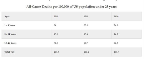 A back-of-the-envelope calculation shows that, compared to 2018 and 2019 deaths per 100k, 2020 saw one extra death among those under age five, an additional 1.5 deaths among those aged 5 to 14, and a whopping 23 additional deaths among those aged 15 to 24. Overall, deaths per 100k in this age group jumped from 106.4 per 100k in 2019 to 131.7 per 100k during 2020. That’s an increase of 23% — and Covid only accounts for 1.2% of total deaths in ages 0–24 years.