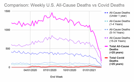 The median age — not the average, but the middle — of Covid-deaths is 80. Covid poses minimal risk to healthy individuals under 65, and is even less of a threat to youths (those aged under 25). In fact, preliminary data suggest Covid accounted for barely 1.2% of all deaths in the under-25 age group. Graphically, that’s the solid red line along the bottom of the graph below — the one you would probably miss if I didn’t draw attention to it. The distance between that and the solid pink line across the top that caught your eye? That represents the other 98.8% of deaths that had nothing to do with Covid.