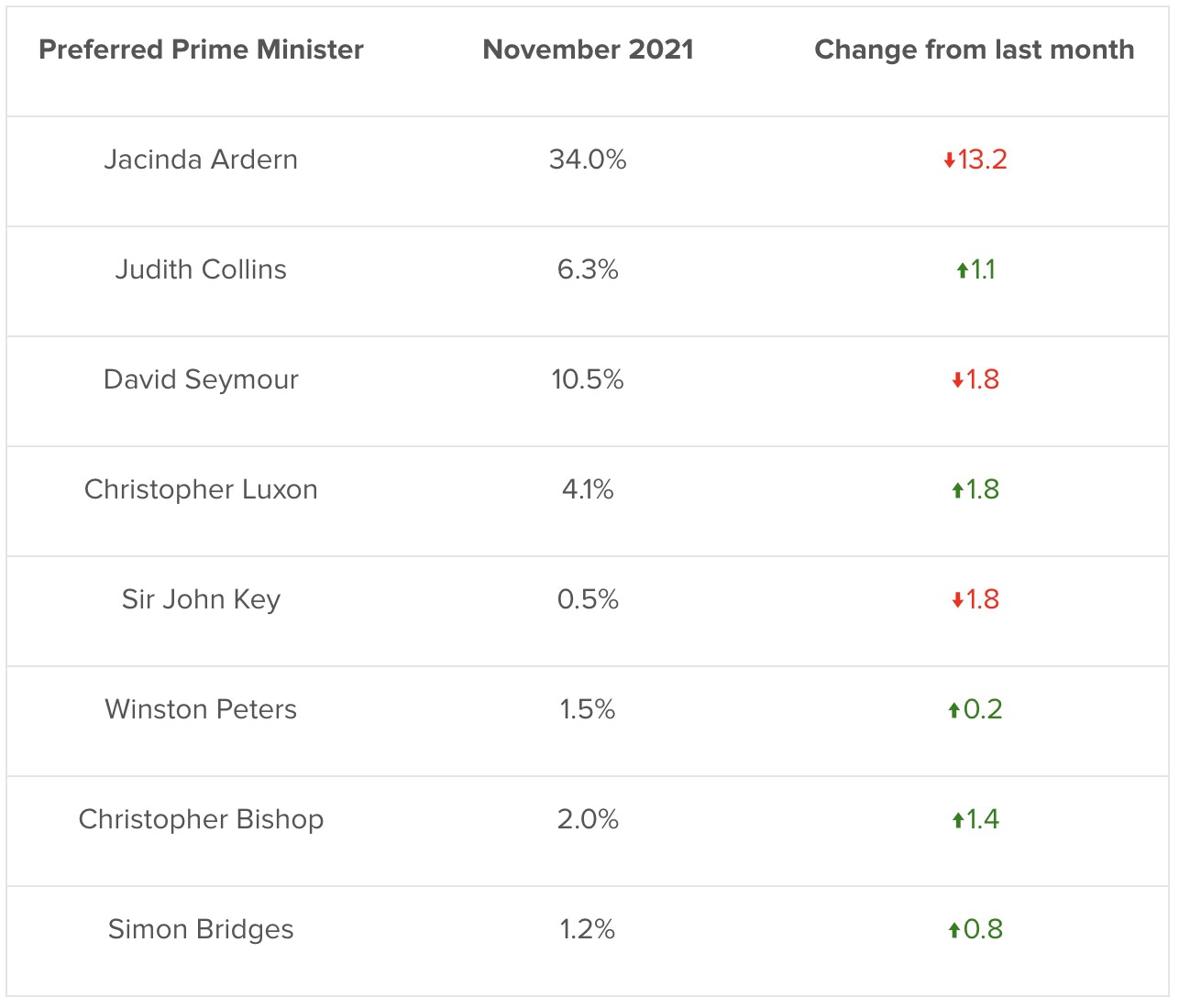 Jacinda Ardern’s 13 point drop is significant, but the Prime Minister still remains well ahead of anyone else. David Seymour continues to rank second, followed by Judith Collins, Christopher Luxon, and Christopher Bishop.
