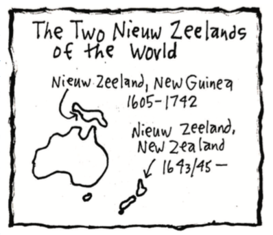 Between the years 1605-1799, there are actually two New Zealand’s in this world, thanks to the Dutch. In November 1605 the Dutch East India Company explorer Willem Jans (or Janz or Janszoon, the suffix “zoon” or “son”is found in many of the surnames of the early Dutch explorers but is no longer in use), sails from Banda Island, Indonesia to east of Ceram Island, and then east between the Kai and Aru Islands and the southwest coast of New Guinea; and names a stretch of this New Guinea coastline “Nieu Zelandt”.
