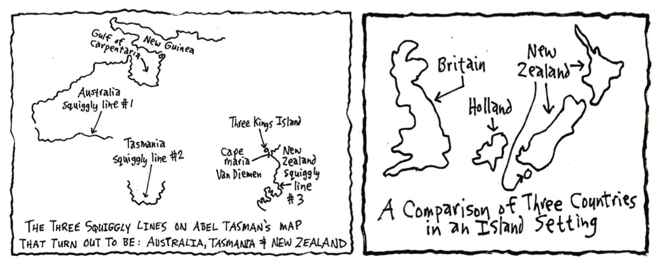 Tasman found Tasmania, named it Van Diemen’s Land, and Staten Landt, which eventually became New Zealand; but left them as small squiggly lines on a map all out on their own in a big ocean.