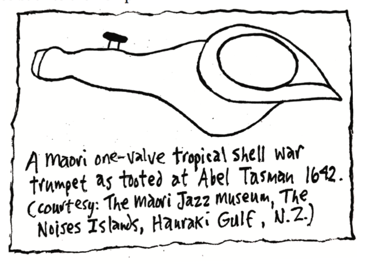 Two Maori war canoes head out towards the Dutch ships blowing what seemed to the Dutch to be “Moors trumpets” (shell horns). A Dutch seaman with a B-flat harmonic bugle, trumpets back at them a few bars from the opening of “Fanfare For The Dutch Fleet”, but the Maori canoes turn around and head back to shore (to get the rest of their instruments the Dutch seaman thinks).