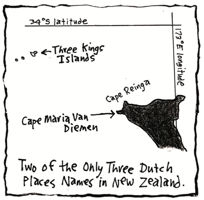 Having sailed along the shore of New Zealand for only 24 days however, Abel Tasman makes quite a contribution to the history of New Zealand. He plays an indirect part in giving it its name; he leaves it with 11 Dutch place names, three of which survive today thanks to James Cook (Cape Maria Van Diemen, Three Kings Island, Tasman Bay); and most importantly of all, he locates New Zealand on a map as a squiggly line floating all by itself out in the Pacific Ocean, a line that will stay a line until James Cook reasons that the line must have some other sides to it, and finds them 129 years later.
