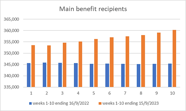 In the 10-week period to September 15, 2023 the number of people on a main benefit rose by 6,768 or almost two per cent, whereas, in the 10-week period ending September 16, 2022, the numbers were virtually flat with a very small decrease of 141 recipients.