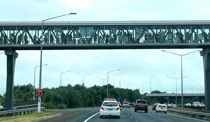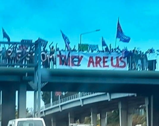 We soon realised that this was one long convoy with huge support! On every overhead bridge was a lineup of enthusiastic placard holders crossing all lanes of the motorway, and vehicles in both directions were hooting in support.