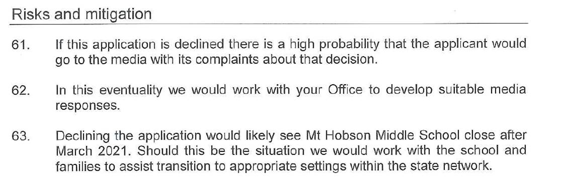 I am writing in reference to the decision to reject the Mt Hobson Middle School Character School application. I would like to communicate the probable consequences of this decision plus give some feedback on the report given to the Education Minister (Mr Chris Hipkins).