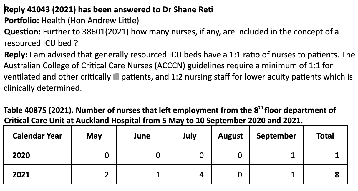 “This is not surprising when answers to my latest written questions have disclosed that 15 vital nurses from Auckland ICU resigned in May, June and July. I’m told they went to Australia due the Government’s pay freeze.