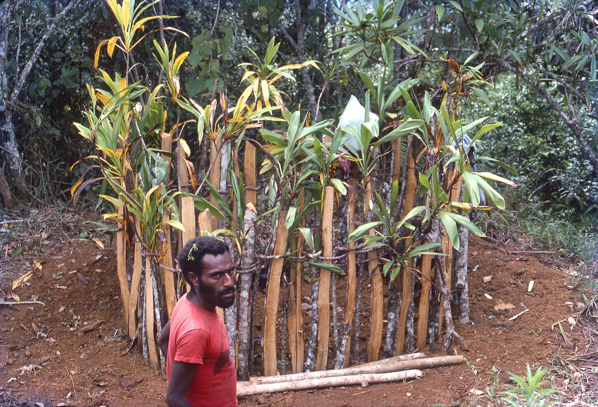 At last, we are here. Nope, this was just the overnight stop. Leave boots on and employ blanket and at dawn we are off again. Note, dear reader, the lack of mention of food thus far – there wasn’t any. Water, yes but food, no. On we go for an hour or so and then the guide points to yet another ridge and declares that as being our destination. On the ridge was a village that consisted of half a dozen huts and not much else. Well, there was something else. Just down the ridge was a crudely constructed picket fence with a bilum (the string bag that all PNG women carry) hanging off one of the stakes. Behind the fence was the object of our trek – a dead villager.