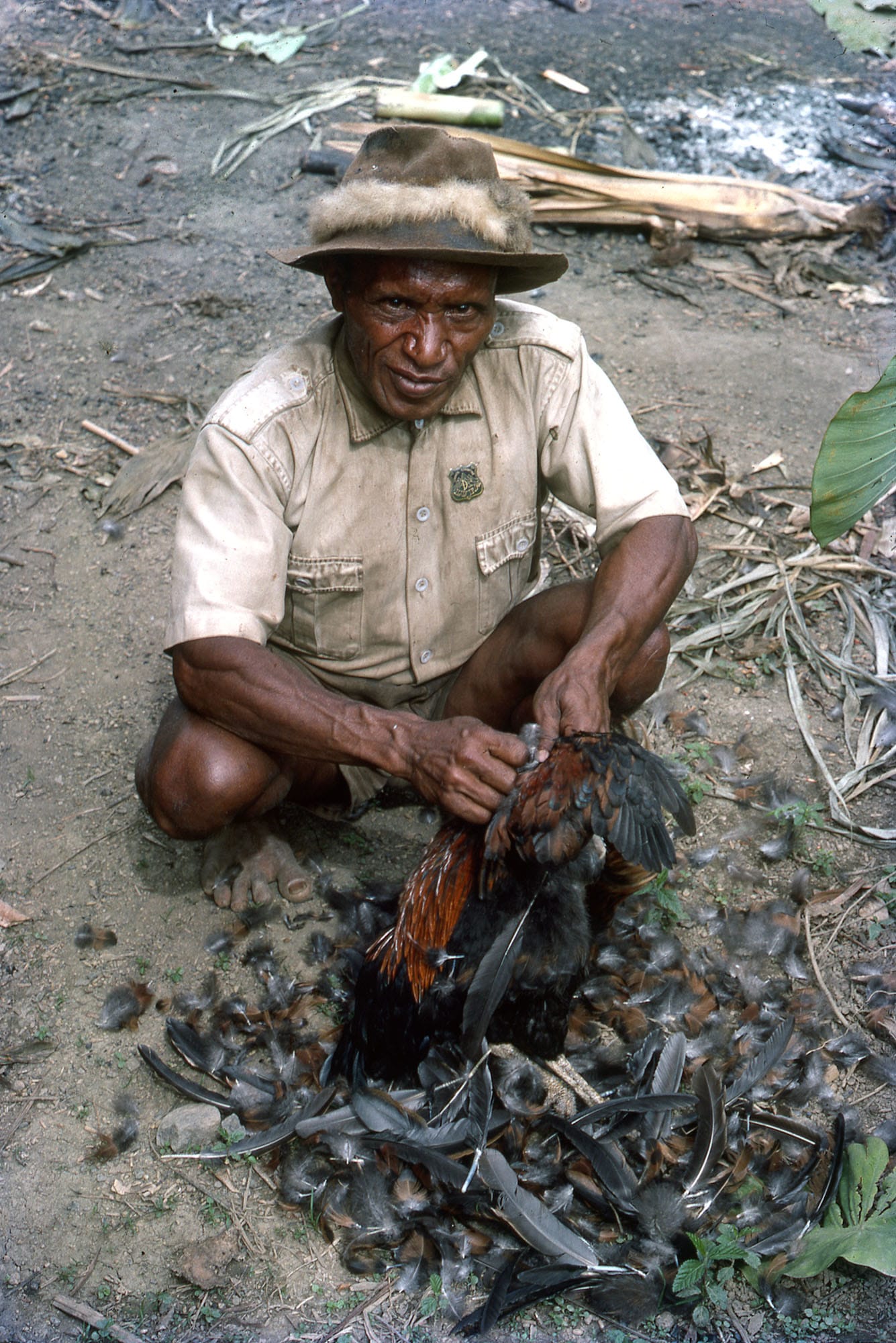 My findings were announced to the surrounding villagers and were greeted with great whoops and hollering. Were they ever pleased? A bit odd, I thought. Then the head of the village came up to me. You knew he was the head because he was wearing a hat with a badge on it issued by the Australian Government saying he was, well, head of the village I suppose. He babbled on at me in one of the hundreds of PNG languages that is not Pidgin and this was translated into Pidgin for my benefit. “Thank you for coming to our village and helping us out – and would you like a chicken?” “My pleasure and, of course.” He then reached down, picked up one of several scraggy chooks running around, wrung its neck and handed it to me.