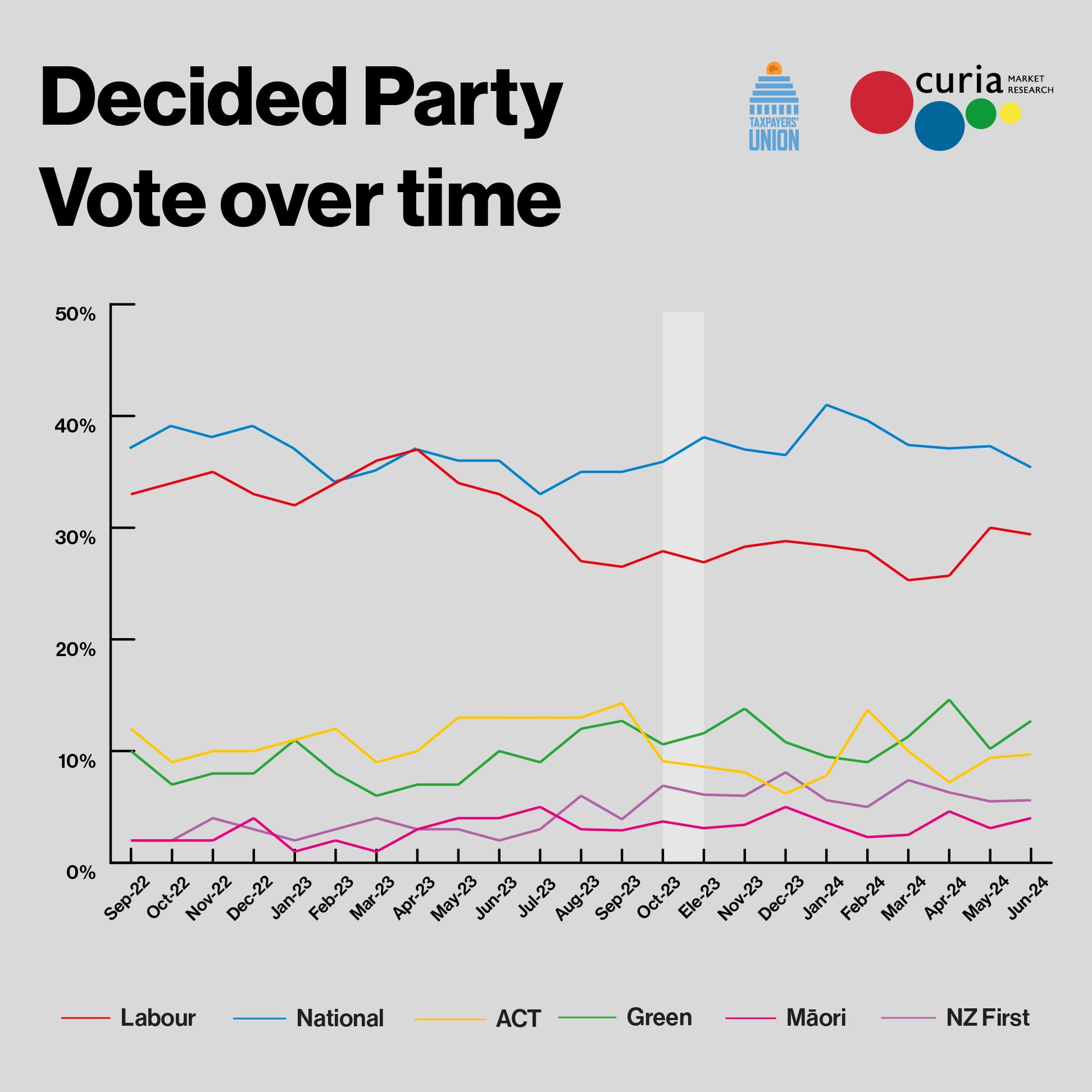 The poll was conducted by Curia Market Research Ltd for the NZ Taxpayers’ Union. It is a random poll of 1,000 adult New Zealanders and is weighted to the overall adult population. It was conducted by phone (landlines and mobile) and online between 4 and 6 June 2024, has a margin of error of +/- 3.1%, and 4.4% were undecided on the party vote question. The full results are at www.taxpayers.org.nz/nztu_curia_2406_poll.