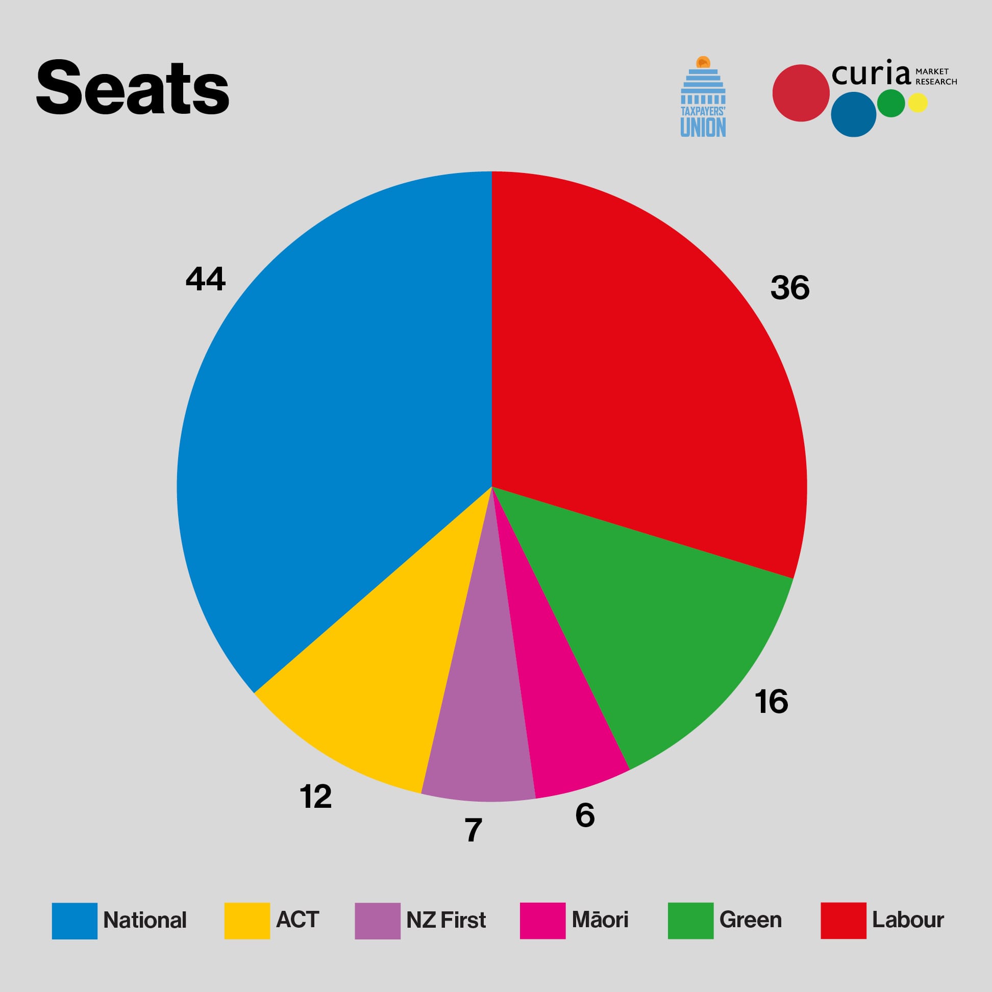 Both NZ First and Te Pati Maori are unchanged on last month on seven and six seats, respectively.