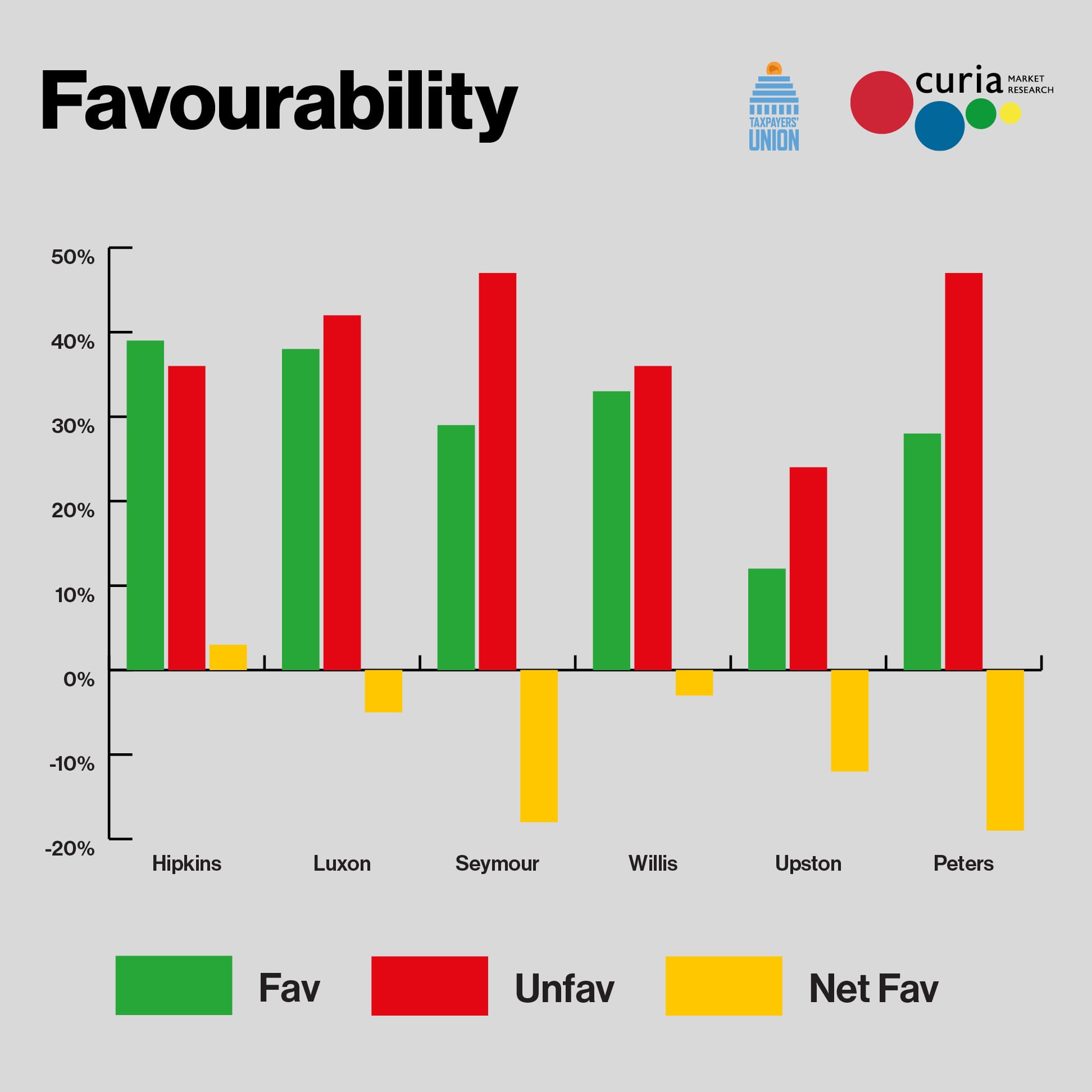 Both David Seymour and Winston Peters see drops in their net favourability from last month to put them on -18% (-11 points) and -19% (-14 points), respectively.