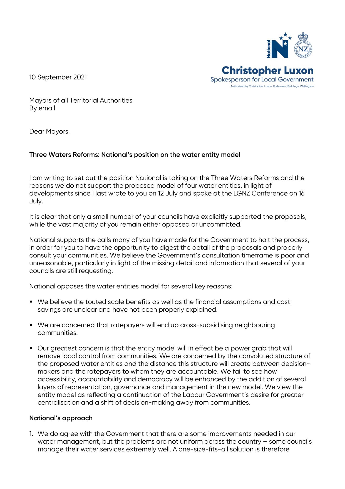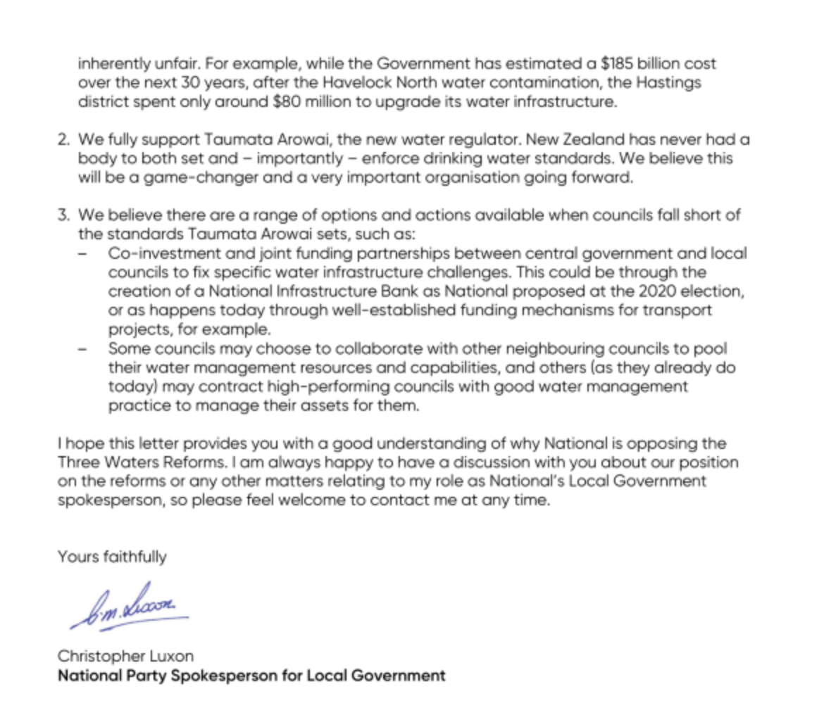 Christopher Luxon’s letter to the NZ government opposing the Three Water reforms:
