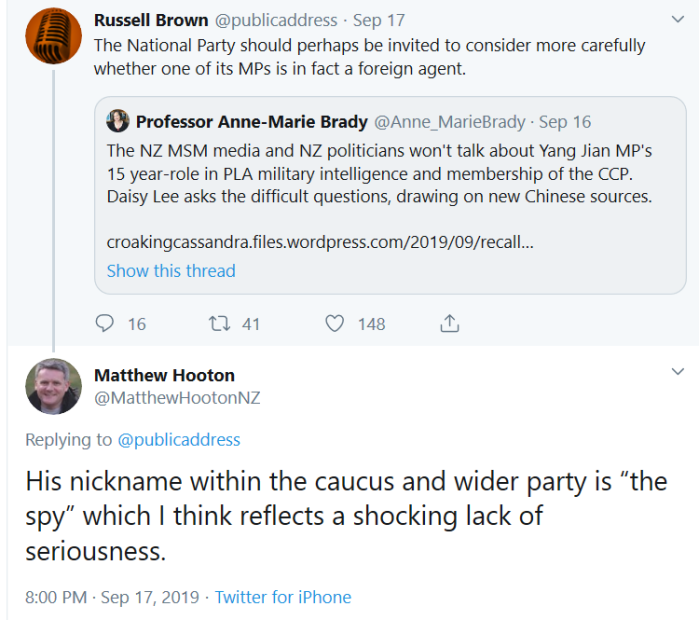 Lest you think I am being too harsh, Matthew Hooton tweeted out that Yang is endearingly referred to as “the spy” within National Party circles.